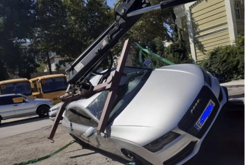 По Аудито има съществени материални вреди. Покривът на колата е килнат, а панорамното стъкло е потрошено.