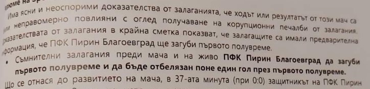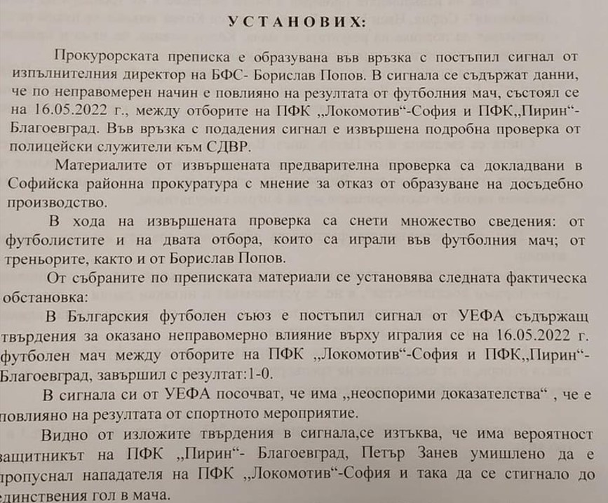 В постановлението на прокурора се споделя: " В хода на осъществената инспекция са снети голям брой сведения от футболистите и на двата тима, които са играли във футболния мач, треньорите, както и от Борислав Попов. В сигнала си от УЕФА показват, че има " неоспорими доказателства ", че е повлияно на резултата от спортното мероприятие. Видно от изложените изказвания в сигнала се акцентира, че има възможност бранителят на ПФК Пирин Благоевград Петър Занев съзнателно да е пропуснал нападателя на Локомотив София и по този начин да се е стигнало до единствения гол в мач В подадения сигнал се показва, че тимът на Локомотив София до седемнадесетата минута на мача не са отправили нито един удар към вратата на Пирин. В подадения сигнал от УЕФА се съдържат голям брой спорни едно на друго изказвания. В подадения сигнал се сочи, че тимът на ПФК Локомотив София е бил преобладаващ през първото полувреме на мача, а в това време се показват подозрения за осъществения гол през първото полувреме точно от тима на Локомотив София. В сигнала се сочат данни, че азиатски букмейкър е повишил коефициентите на залозите по отношение на победа на тима на Локомотив София. В сигнала се показва, че при залаганията по отношение на резултата от мача е било налице " ирационално държание ".