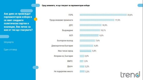 ГЕРБ (23.8%) резервира лидерската позиция, а дистанцията й с „ Продължаваме промяната " (17.5%) се усилва, заради продължаваща ерозия в поддръжката по отношение на главната ръководеща групировка. Движение за права и свободи поддържа обичайните си равнища от близо 11%. Четвъртото място този месец се заема от „ Възраждане " (10.1%), които изпреварват с няколко десети от % Българска социалистическа партия (9.5%). На своя старт „ Български напредък " е шеста политическа мощ с поддръжка от 7.6% от гласуващите. „ Демократична България " остава с поддръжка от 6.8% от гласуващите, следвана от „ ИТН " с 5.8%. Под бариерата, само че над % поддръжка, са „ Изправи се, България " с 2% и Вътрешна македонска революционна организация 1.5% от гласуващите.