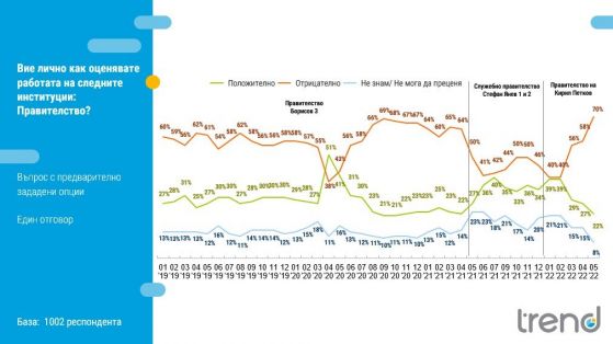 При държавното управление се следи същият тренд – през април позитивната оценка по отношение на кабинета е била 27%, до момента в който през сегашния месец е към този момент 22%. Почти всички последователи на „ Продължаваме промяната " поддържат държавното управление, до момента в който симпатизантите на останалите сътрудници в ръководеща коалиция са по-разколебани.