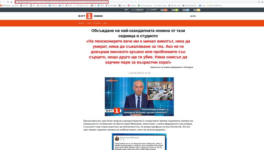 В публикацията се дискутира " разпространяване на ново лекарство за лекуване на хипертония измежду възрастни хора " и се цитира фиктивен статус на Цветеслава Минкина, показана като " заместник-главен фармацевт в България ". Твърди се, че въпросната жена желае да изнася лекарството от страната ни за сметка на българските пенсионери.
