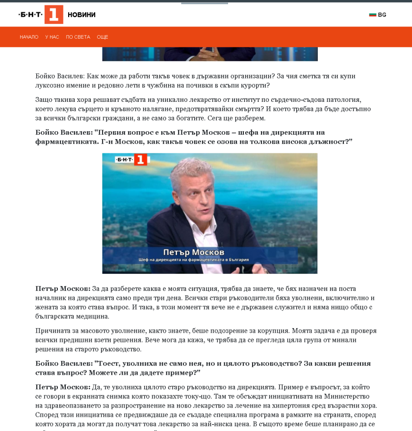 Фалшива платформа употребява визията на уеб страницата на " По света и у нас " bntnews.bg и показва подправено изявление на водещия на " Панорама " Бойко Василев с " шефа на дирекцията на фармацевтиката " и " ръководителя на Центъра за сърдечно-съдова хирургия. "