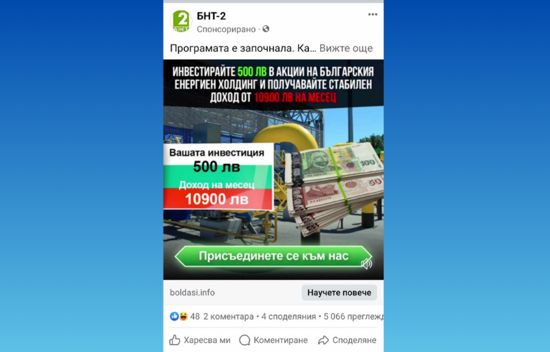 Фалшива страница във фейсбук предлага от името на Българска национална телевизия 2 потребителите " да влагат акции " в Българския енергиен холдинг.
