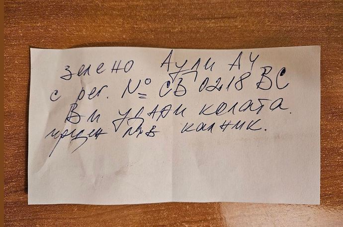 търси се зелено Audi A4 с рег. номер: CB0218BC, което е забърсало синичка Ford Fiesta с рег. номер: CB7029XC на ул. " Теменуга ", кв. " Слатина ", или положителния самарянин, който е оставил тази записка на Fiesta-та.