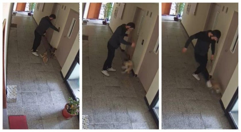 Бруталните фрагменти провокираха възмущението на десетки консуматори във фейсбук. На тях се вижда мъж с две кучета, които води в кулоар на блок. Докато биячът чака асансьора, не стопира да рита, хвърля във въздуха и удря в земята едното от животните.
