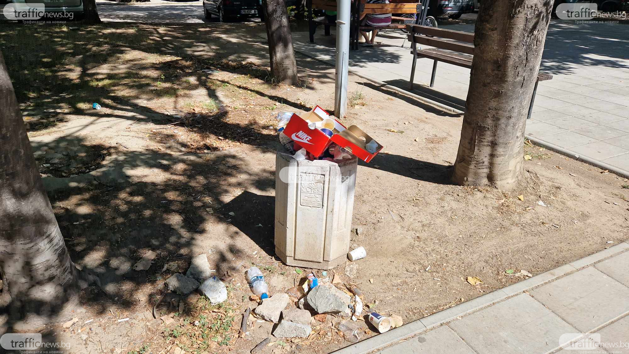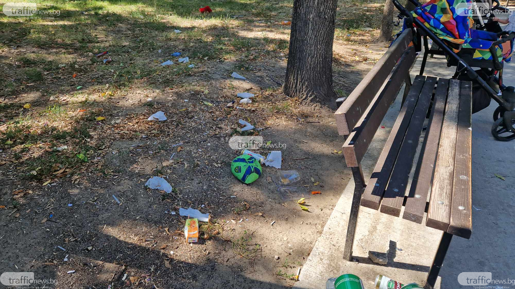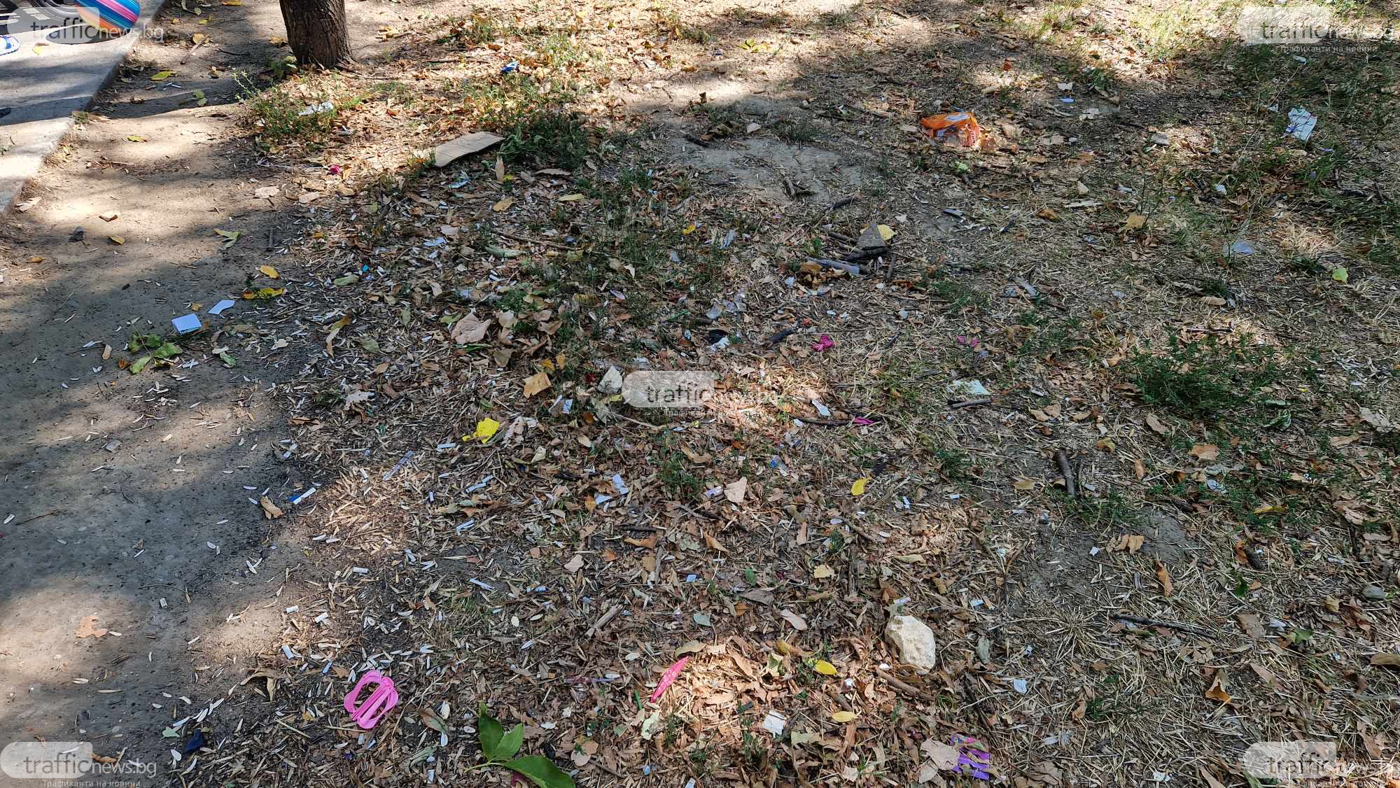 Днес обаче кошовете за отпадък още веднъж са претъпкани, по земята се търкалят всевъзможни боклуци. Навсякъде хвърчат опаковки от храна, кенчета от алкохол и енергийни питиета, чаши от кафета. Зелените площи са цялостни с фасове.