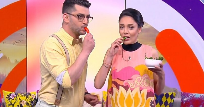 Само след секунда и двамата се запревиваха, тъй като чушлетата се оказаха доста строг. Екипът незабавно потегли да пуска анонса за тематиките на предаването, с цел да могат водещите да поемат мирис и да пият вода.