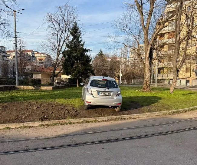 На фрагментите се вижда по какъв начин автомобилът е ситуиран умерено върху зелената повърхност на трамвайното обръщало – място, което явно все по-често се бърка с спонтанен паркинг. Тревата в близост към този момент е превърната в кално леке, което подсказва, че това надали е първият „ посетител “ на четири колела, решил да си спести обикалянето за свободно място.