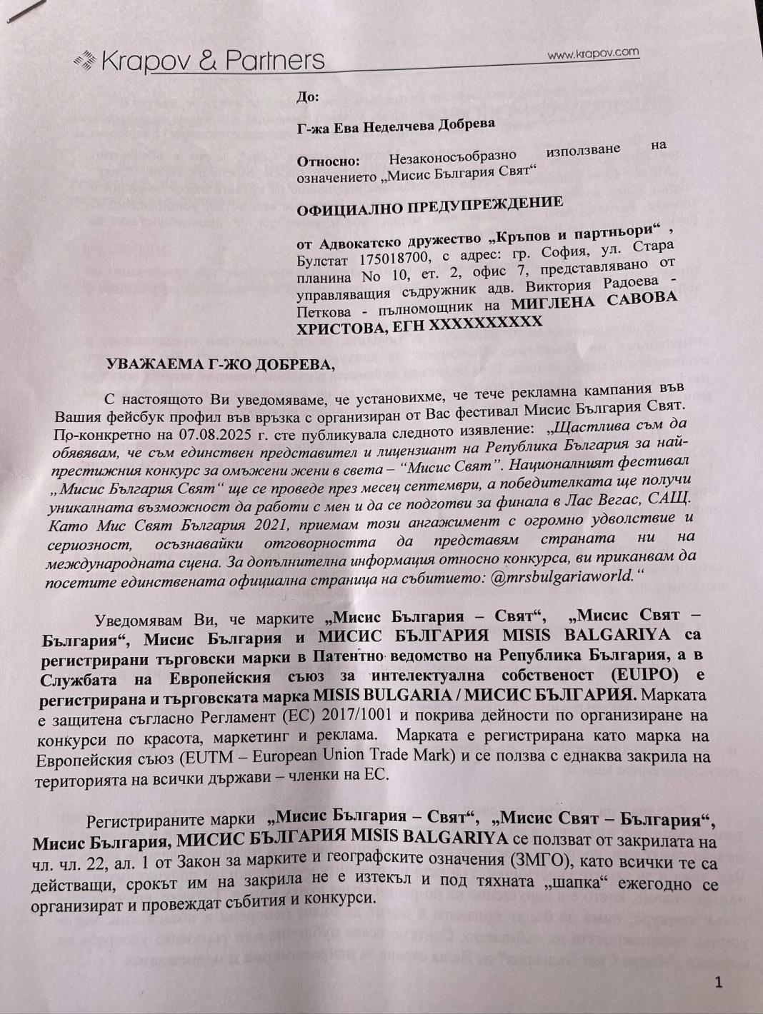 Оказва се обаче, че марката „ Мисис България Свят “ има регистриран притежател – това е Меги Савова, която държи правата ѝ освен в България, само че и за територията на цяла Европа. Савова реагира остро на новината за фестивала във Варна. По думите ѝ тя била осведомена за обявата от свои познати, защото самата тя е блокирана в обществените мрежи от Добрева. „ Това, че има сделки да праща българка на „ Мисис Свят “, не ѝ дава право да провежда събитие с сходно име у нас “, разяснява Савова и приложи документи, удостоверяващи собствеността ѝ върху марката.