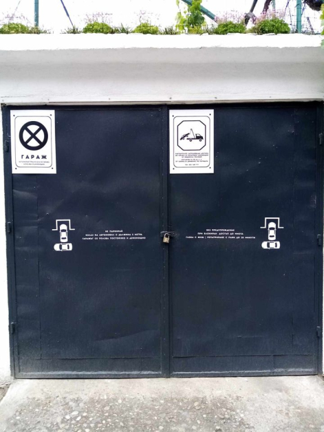 „ Не паркирай! Излаз на автомобил с дължина 5 метра. Гаражът се употребява непрекъснато и непрекъснато. Без предизвестие при блокиран достъп до парцела – санкция с фиш и репатриране с паяк до 20 минути ”.