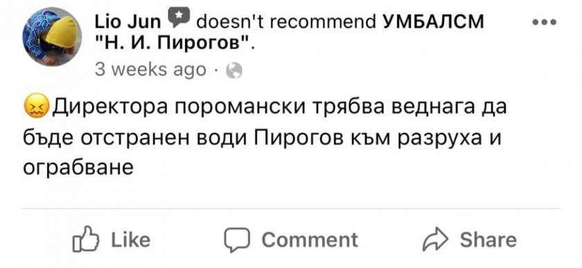 Самите чиновници, несъмнено, само че дребна част от тях, даже се осмелиха да пишат по проблематичната тематика в обществените мрежи, въпреки и с риск да си основат в допълнение проблеми, защото не могат да стигнат до диалози с управлението на " Пирогов ".