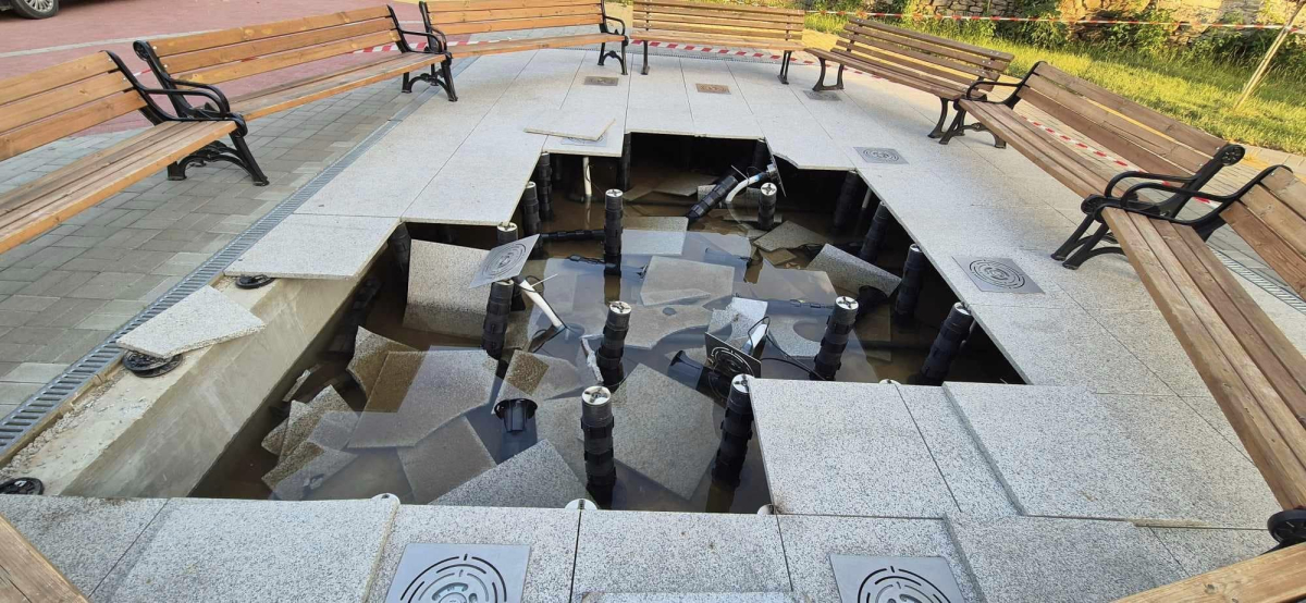 Така хора от пловдивския Първенец разясняват протичащото се в селото. На фотоси, оповестени в една от групите на Фейсбук, се вижда 3-тонен пикап, претрупан с машина за напръскване на комари, пропаднал на плочките на площада. Двете гуми на автомобила са безусловно погълнати от напълно сменената в края на предходната година настилка на площада.