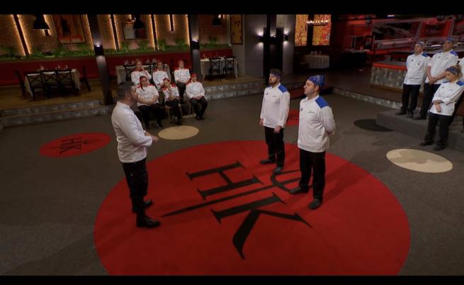 Вечерята стартира с запалени печки в двете кухни и шефмобили, на които Мариела и Камен получиха персонални указания от су-шефовете за приготвянето на авторския специалитет на шефа. Мариела избави съотборниците си с концепцията си за амюз буш, а при Сините си личеше наближаващия спор сред Николай и Денислав. Заявката на Андреа да бъде мощна жена в мъжкия тим беше опровергана от чаша бяло вино и изгонването на Николай в общежитието. С напредването на вечерта началник Ангелов упъти също по този начин Андреа и Камен вън от кухнята на Сините, а Валентина от Червения тим получи последно предизвестие за грешките си. Опълченците на Синята кухня не се предадоха, само че шефът им уточни вратата, до момента в който Червените издадоха последните си поръчки на магия. В Синия тим номинирани бяха Денислав и Николай, само че началник Ангелов избра да връчи оранжевата престилка на Андреа.