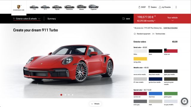 Porsche към този момент предлага опцията да конфигурирате колата на фантазиите си в онлайн конфигуратора на марката и да сбъднете фантазията си като завършите конфигурацията с поръчка, непосредствено от уеб страницата на марката. Функцията е нова за компанията и все още е налична само в родната Германия, само че се чака да бъде публикувана и в други страни в Европа в идващите месеци.