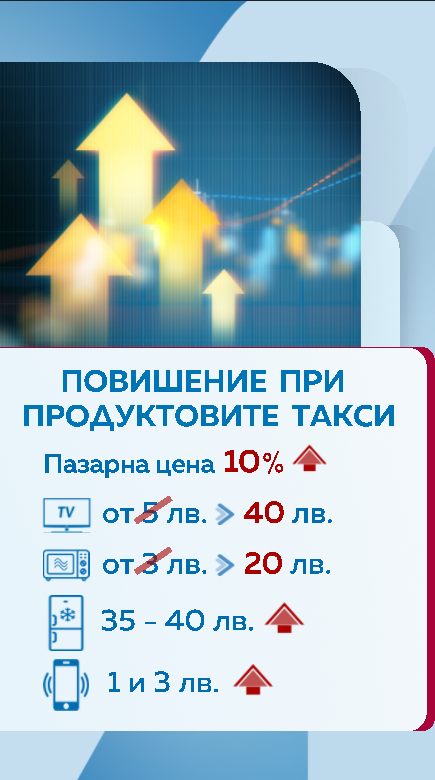 Важно конкретизиране е, че такса за даден апарат се дефинира на база килограми. Колкото по-тежък е той, толкоз по-висока ще е продуктовата такса. Очаква се междинното нарастване на цените на бялата и черната техника да е с към 10 %.
