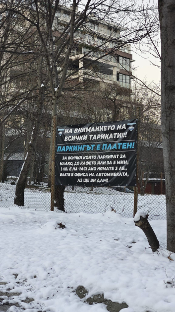 „ На вниманието на всички тарикати!!! Паркингът е заплатен! За всички, които паркират за малко, до кафето, или за 5 мин., 3 лв. е на час! Ако нямате 3 лв., елате в офиса на автомивката, аз ще ви дам!, “ гласи текстът.
