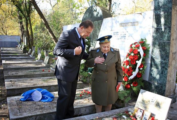 Ангел Найденов с полковник Митка Захариева на гроба на нейния брат, помощник-командира на парашутната тайфа, полк. Димитър Николов в Алеята на парашутистите в Централните софийски гробища