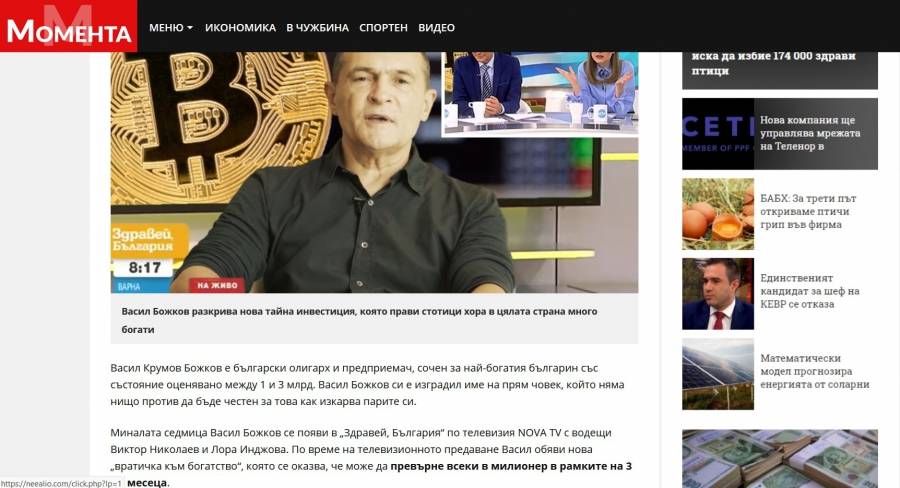 Още в самото начало на материала, който сякаш е писан на 15 декември, се твърди, че " предходната седмица " в утринния блок на Нова телевизия " Здравей, България " се появил Васил Божков. Той " разгласи нова " малка врата към благосъстояние ", която се оказва, че може да трансформира всеки в милионер в границите на 3 – 4 месеца. И несъмнено, минути след приключването на изявлението Българска национална банка се обади, с цел да спре излъчването му – само че към този момент беше късно ".