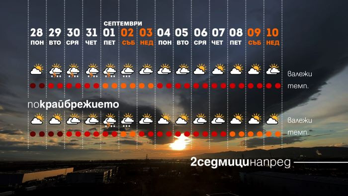 В първите 4-5 дни на септември времето ще е по-нестабилно с променлива облачност, условия за превалявания и дневни температури в интервала от 25 до 31-32 градуса. След това чувството за късно лято ще се върне с повече слънце и по-високи температури.