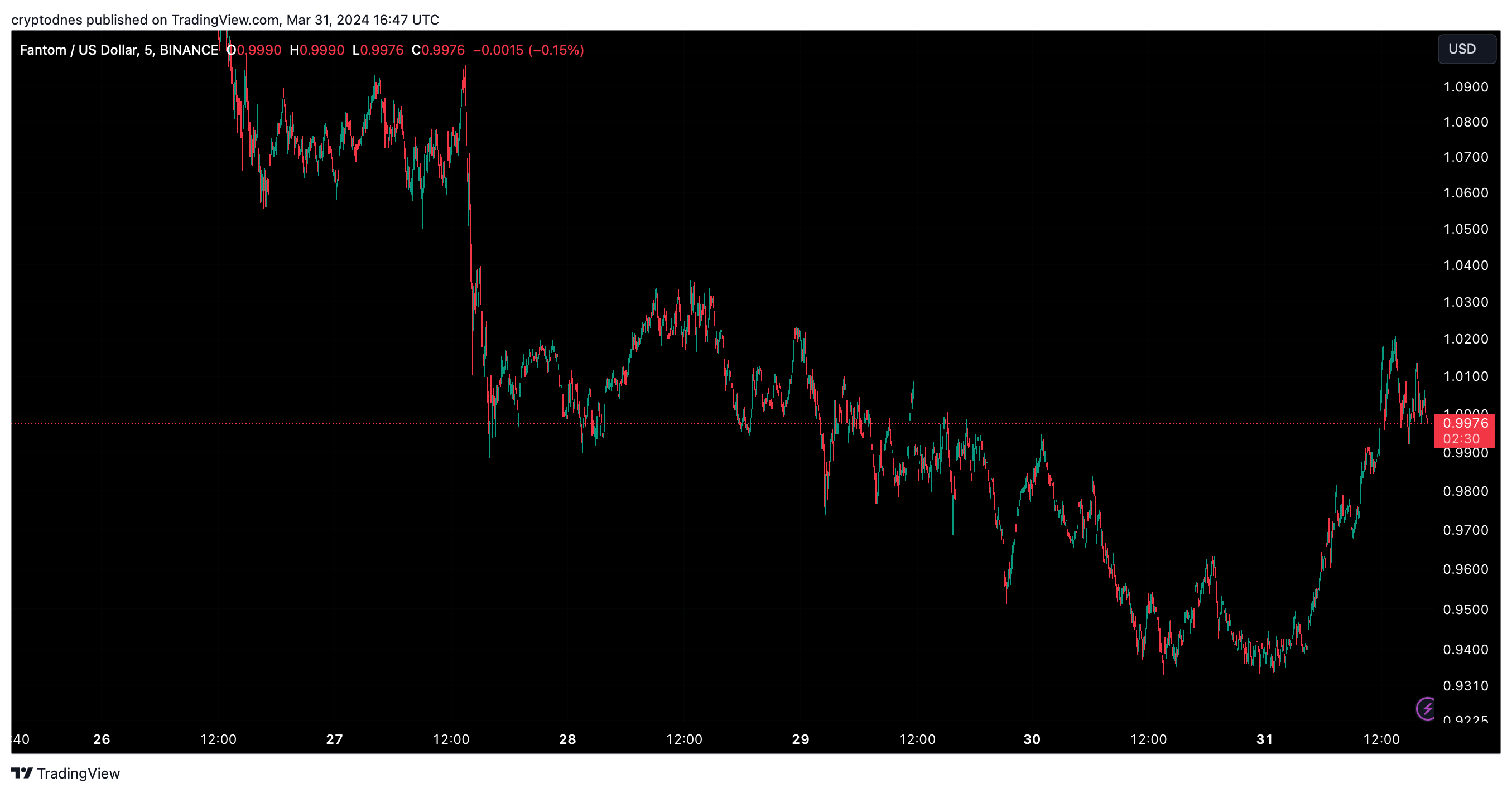 След като неотдавна доближи двугодишен връх от $1.1378, Fantom от този момент се намали до $1 все още на писане на публикацията. Пазарната му капитализация също е намаляла до $2.8 трилиона, което съставлява растеж от 5%.