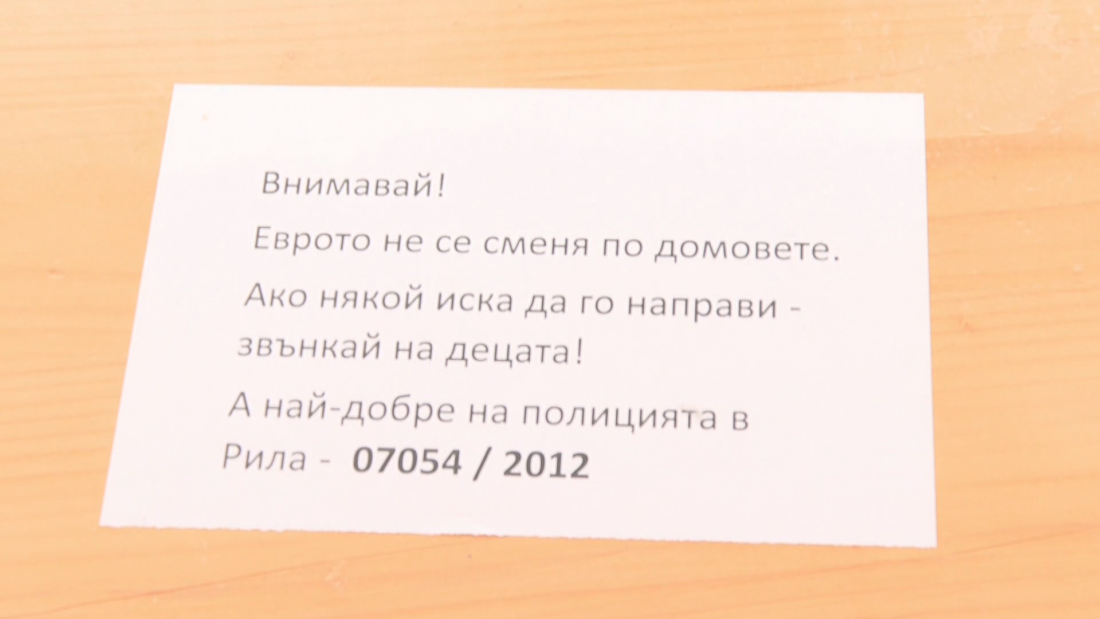 Стефка Зашева, кметски наместник на село Смочево: " Еврото не се сменя по домовете, в случай че някой желае да го направи, звънкай на децата, а най-добре на полицията в Рила и телефона на полицията в Рила. Според мен този текст интригува и обръща внимание и ги кара да се замислят. "