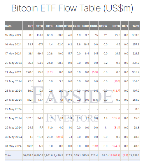 Последните данни на Farside сочат, че на 31 май спот Биткойн (BTC) борсово търгуваните фондове (ETF) са отбелязали нов приток, който отразява сумата от $48.8 милиона от предходния ден. Въпреки тези притоци единствено двама емитенти са отчели позитивни чисти притоци.
