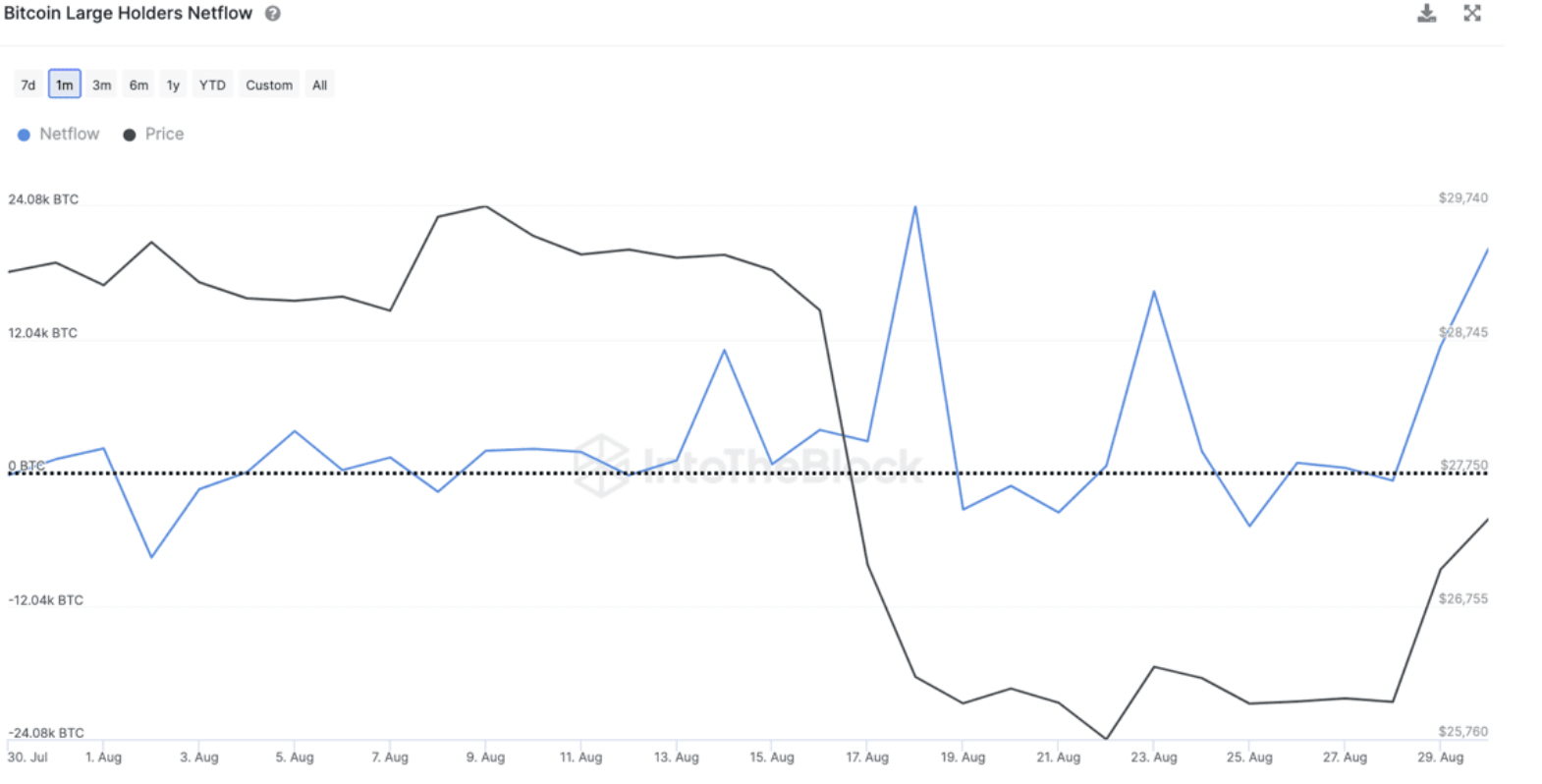 Според сведенията на платформата за пазарна информация IntoTheBlock, физически или юридически лица със обилни дялове в Биткойн, представляващи 0.1% от общото предложение на Биткойн или повече, са добавили към портфейлите си BTC на стойност над $1.5 милиарда от средата на август насам.