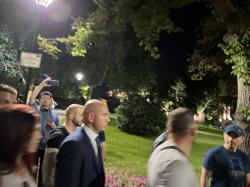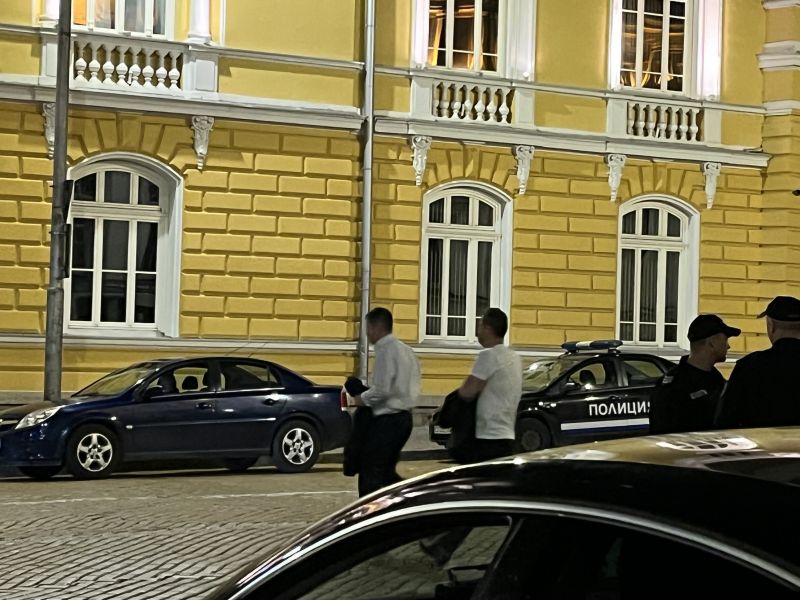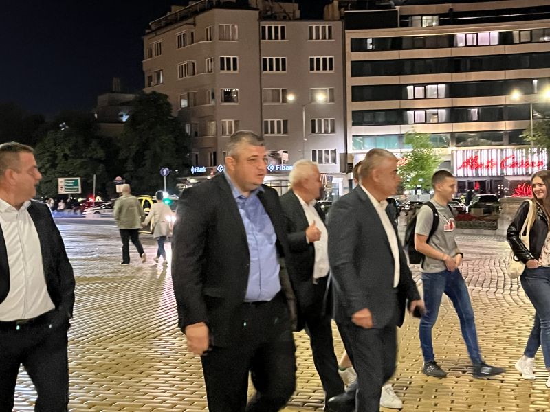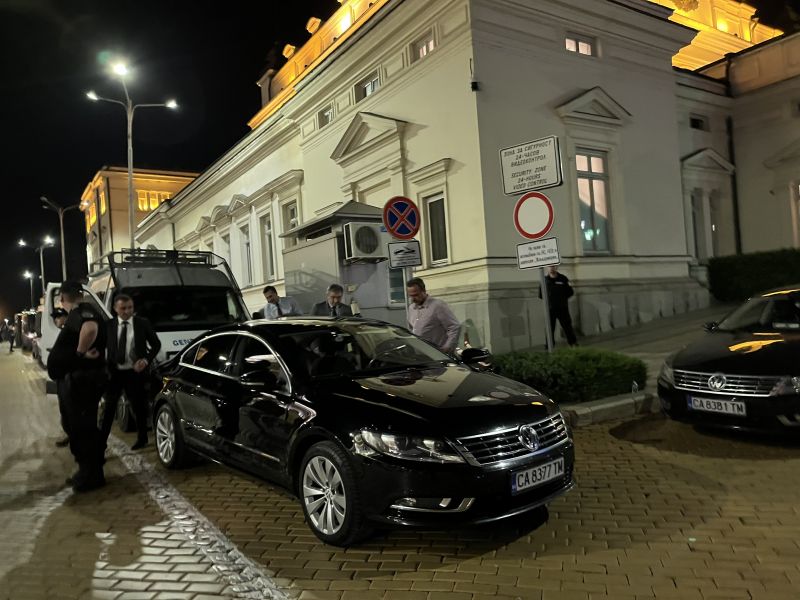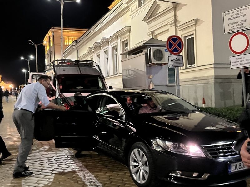 В 23:36 ч. през същия вход си потегли и Делян Добрев от ГЕРБ-СДС. Той също продължи пешком.