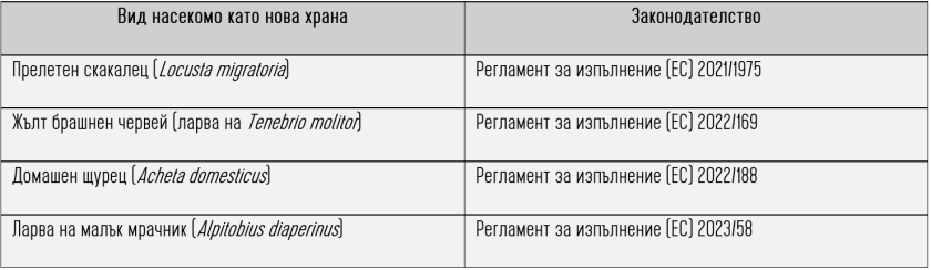 От и година към този момент може да се влагат в храните артикули от насекомите - домашен щурец, ларвата на дребния мрачник, прелетeн скакалец, жълт брашнен червей.