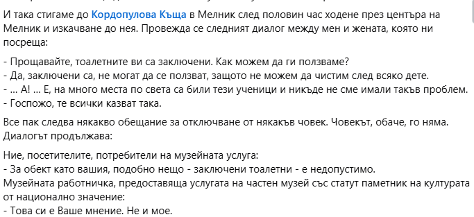 Пост в обществената мрежа Фейсбук, оповестен на 28 април от Камелия Конакчиева-Трибулен, конферентен преводач, съосновател и началник на учебното заведение „ Кирил и Методий “, както и на първата българска гимназия в Париж, сложи мъчителна тематика на дневен ред – достъпът до тоалетни в туристически и културни обекти в България. Поводът – посещаване на Кордопуловата къща в Мелник по време на учебен маршрут, финансиран от Министерството на образованието и науката.