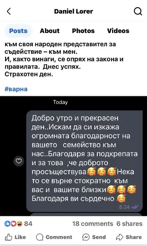 Пост в обществените мрежи на депутата Даниел Лорер от “Продължаваме смяната - Демократична България ” (ПП-ДБ) предивзвика бурни и смесени реакции. Причината за това е, че в началото депутатът разгласява скрийншот на известие от 8:24 ч., сутринта, в което се вижда по какъв начин човек му благодари за поддръжката. Депутатът прецизира, че до отправените благоднарностите се е стигнало откакто “той е оказал помощ на един елементарен варненец да избави наследения си имот от имотната мафия на предходната администрация на ГЕРБ ”.