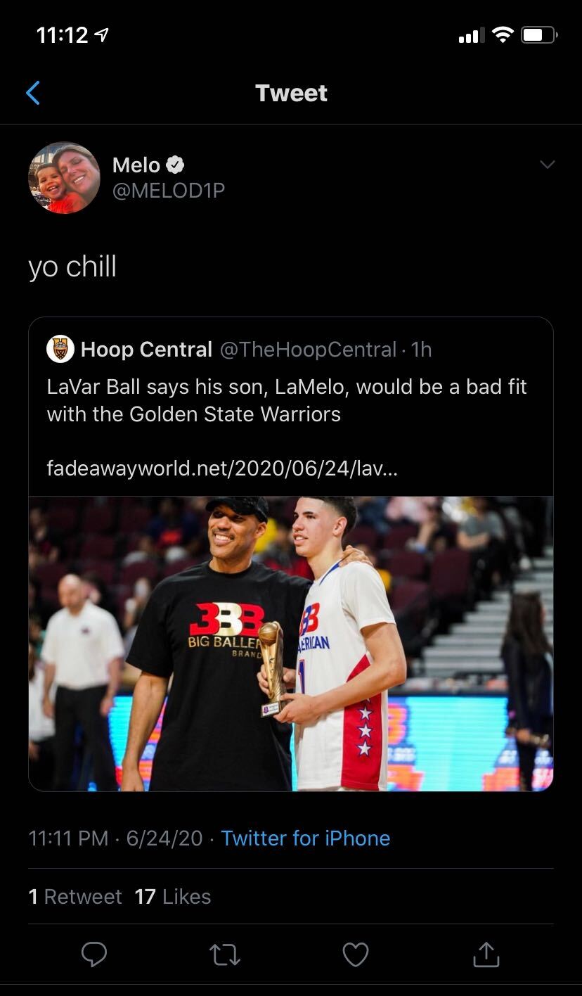 18-годишният младеж написа " я се успокой " като отговор в " Туитър " на думите на татко си, а забавното в тази ситуация е, че обявата към този момент е изтрита от него. ЛаВар сподели още в изявлението си, че Мело не е почитател и на него няма да му хареса да следва водачите Стеф Къри и Клей Томпсън при " войните ".