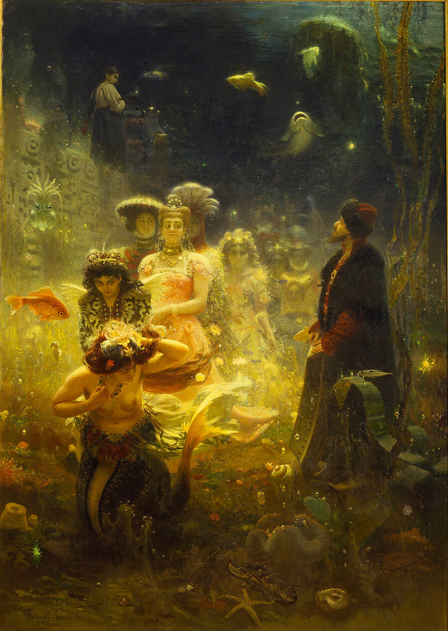 Свободни източници И други художници се насочват към приказната тема. Например под въздействието на познанството си с Виктор Васнецов, Иля Репин рисува популярното си приказно платно за епичния воин Садко, който поема към морското дъно и по разпореждане на морския цар търси невести – морски хубавици.