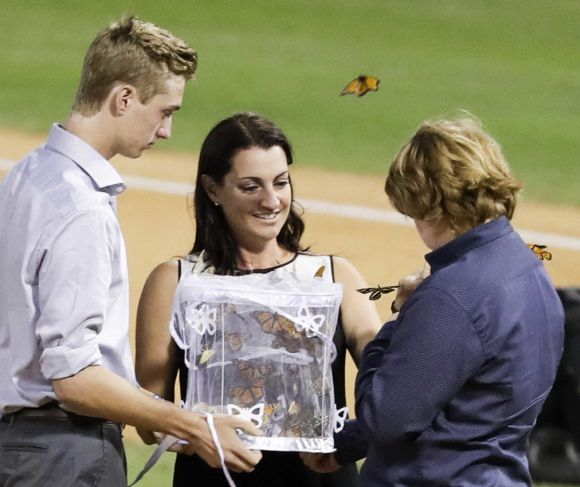 В края брачната половинка му Бренди Халадей и синовете им Брейдън и Райън застанаха на питчерското нагорнище и пуснаха на независимост десетки пеперуди. Някои от феновете по трибуните също се включиха в символичното прощаване с Рой Халадей.