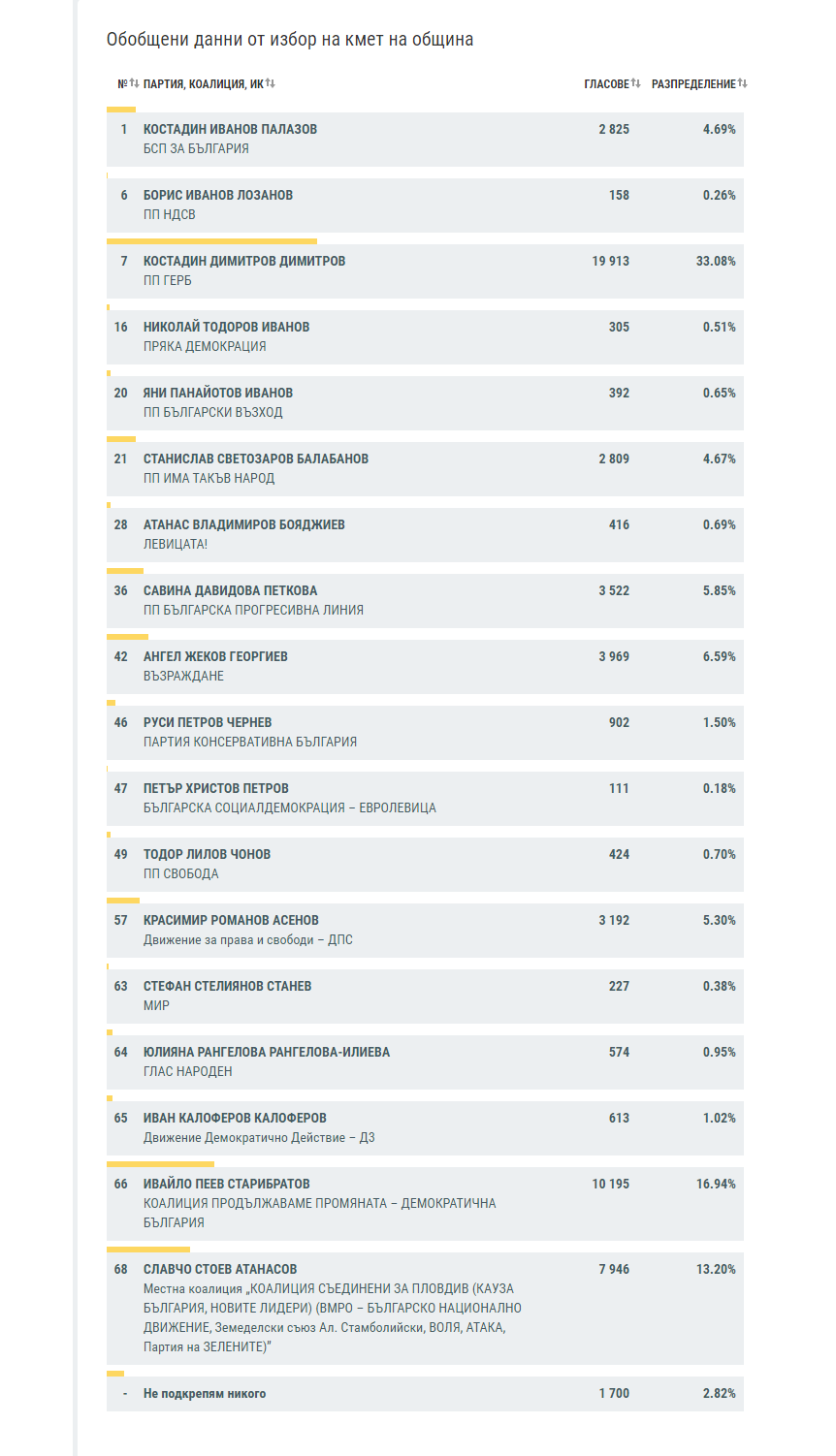 Костадин Димитров от ГЕРБ получава 19 913 гласа, което са 33.08% . Проф. Ивайло Старибратов, ПП-ДБ - 10 195 или 16.94% , Славчо Атанасов, „ Коалиция Съединени за Пловдив ” - 7 946 , 13.20%, Ангел Георгиев от Възраждане – 3 969 , 6.59% , а Савина Петкова от „ Браво, Пловдив ” е получила 3 522 гласа, 5.85% .