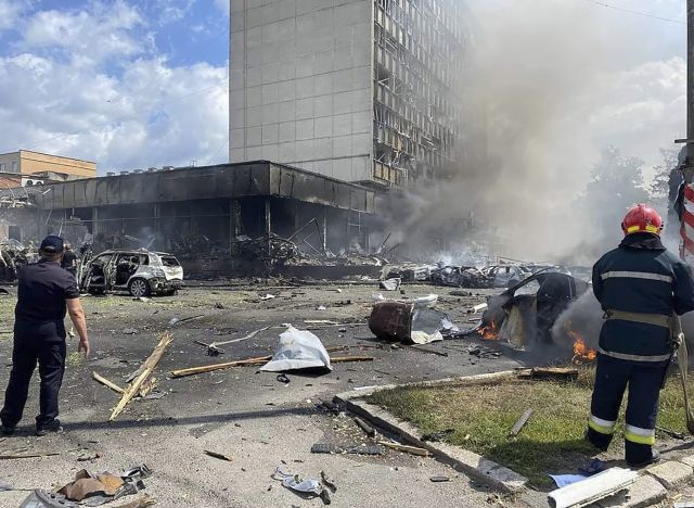Гъст пушек, издигащ се от висока постройка, и спасители, втурващи се към мястото на случая, се виждат на видеоклип, споделен в интернет. Украинските незабавни служби разгласиха фотоси, които демонстрират редици изгорели коли и тлеещи парчета, а на една от тях се вижда преобърната детска количка, изоставена на улицата.