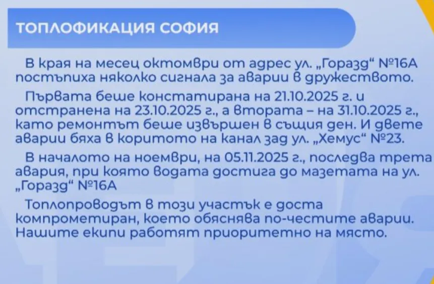 " Случвало се е повече от седмица да няма топла вода. Съответно казусът е, че не се обръща съществено внимание на повредите. Те са голям брой, а се отстраняват на парче. Става въпрос за трасе, което е не повече от 10, 12 метра. Тази тръба се пука непрекъснато или на доста места. Това предизвиква един непрекъснат теч. Нашият партерен етаж не е изсъхвал. Отстранява се едно, а безусловно след него стартира да тече още веднъж ".