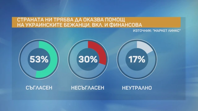Повечето интервюирани – 53%, считат, че страната ни би трябвало да оказва помощ на украинските бежанци, в това число и финансова. 30% са срещу, а 17% са неутрални.