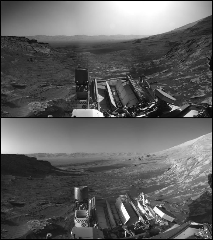 В центъра на изображението се вижда ската на планината Шарп, чийто връх се извисява на 5,5 км от центъра на кратера Гейл. В дясно пък откриваме групировката, наречена планината Рафаел Наваро, кръстена на учения, който оказва помощ за идентифицирането на органичните смеси на Марс. За страдание, Рафаел Наваро умря по-рано тази година.