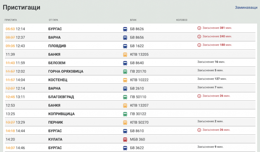 Повреда в контактната мрежа в сектора Елин Пелин - Костенец докара до голямо забавяне на вечерния бърз трен от Бургас до столицата. По разписание тренът трябваше да дойде в столицата в 5:53 ч, само че досега е натрупал забавяне от близо 400 минути!