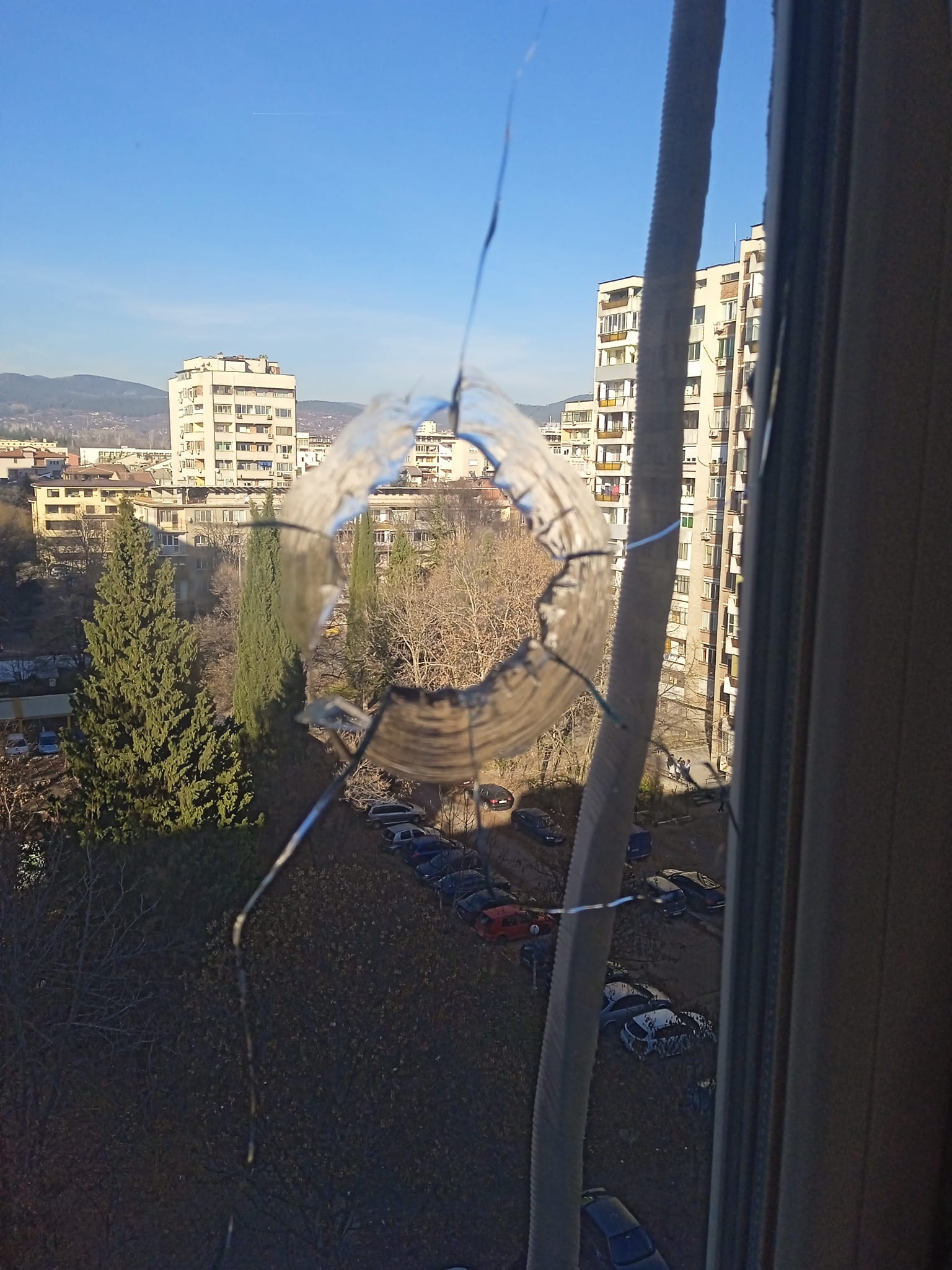 Димитър Бонев показа фотография в обществената мрежа Facebook, която демонстрира в какво положение е прозорецът в стаята на децата му. Мъжът отбелязва, че живеят на осмия етаж в жилищна постройка в Стара Загора. Той допуска, че счупеният прозорец е вследствие на пиротехническо произведение.
