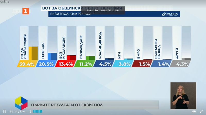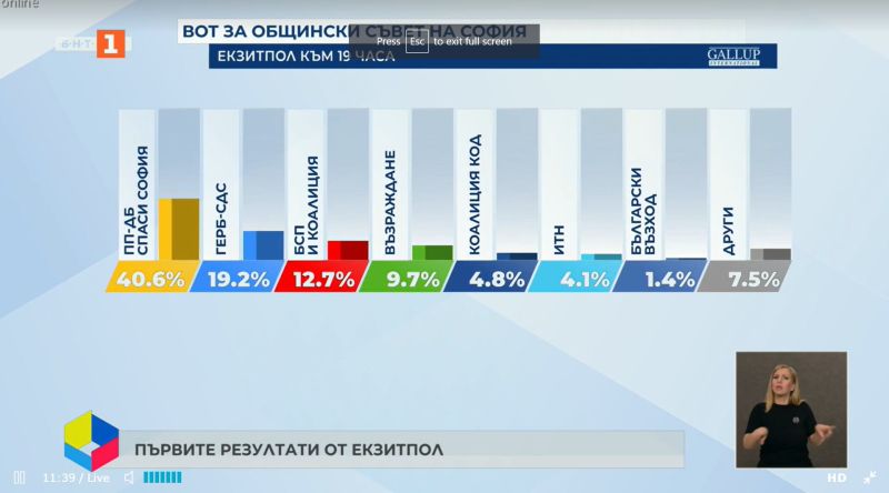 Според данните на " Галъп интернешънъл болкан " ПП-ДБ печели 40.6% от гласовете на гласоподавателите за СОС. На второ място е ГЕРБ-СДС с 19,2%. На трето място с 12,7% е Българска социалистическа партия, следвана от " Възраждане " с 9,7%, Коалиция " КОД " с 4,8%, Има Такъв Народ - 4,1%. " Български напредък " на Стефан Янев получава 1,4%.
