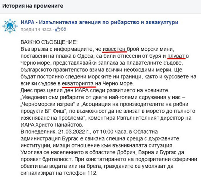 „ Във връзка с информациите, че известен брой морски мини, сложени на плажа в Одеса, са били отнесени от стихия и плуват в Черно море, представлявайки опасност за плавателните съдове, българското държавно управление взима всички нужни ограничения. Ще бъдат непрекъснато следени морските ни граници, както и курсовете на всички съдове в екваторията на Черно море “, оповестиха нощес от пресцентъра на Министерски съвет с публично известие, изпратено до медиите.