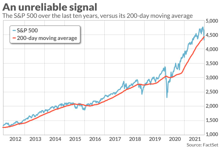 Освен това, нито една от регистрираните в тази диаграма разлики не е забележителна при 95% равнище на доверие, което статистиците постоянно употребяват, когато дефинират дали даден модел е същински.Последните 30 годиниМоже да се притеснявате, че историята, разказана от тази диаграма, е изкривена от опита преди доста десетилетия и не е толкоз уместна за днешния пазар. Всъщност моделът, показан в таблицата, би бил още по-изразен, в случай че се концентрира единствено върху последните две или три десетилетия. Това не е инцидентно. Това е тъкмо това, което бихте очаквали, като се има поради появяването на елементарно и на ниска цена търгувани борсово търгувани фондове, съпоставени с S&P 500 (или други сравнителни индикатори за необятен пазар).Обърнете внимание на графиката нагоре, която изобразява S&P 500 през последното десетилетие дружно с неговата 200-дневна пълзяща междинна. Забележете, че по-често през последните 10 години, когато S&P 500 падне под своята 200-дневна пълзяща междинна, той нормално обръща курса и се повишава.Няма гаранция, че и този път ще се случи същото. Всъщност актуалните вероятности на фондовия пазар може да са мрачни. Въпросът е, че вероятностите му не са по-лоши единствено тъй като 200-дневната пълзяща междинна е била пробита, съгласно Марк Хълбърт, помощник на изданието MarketWatch.