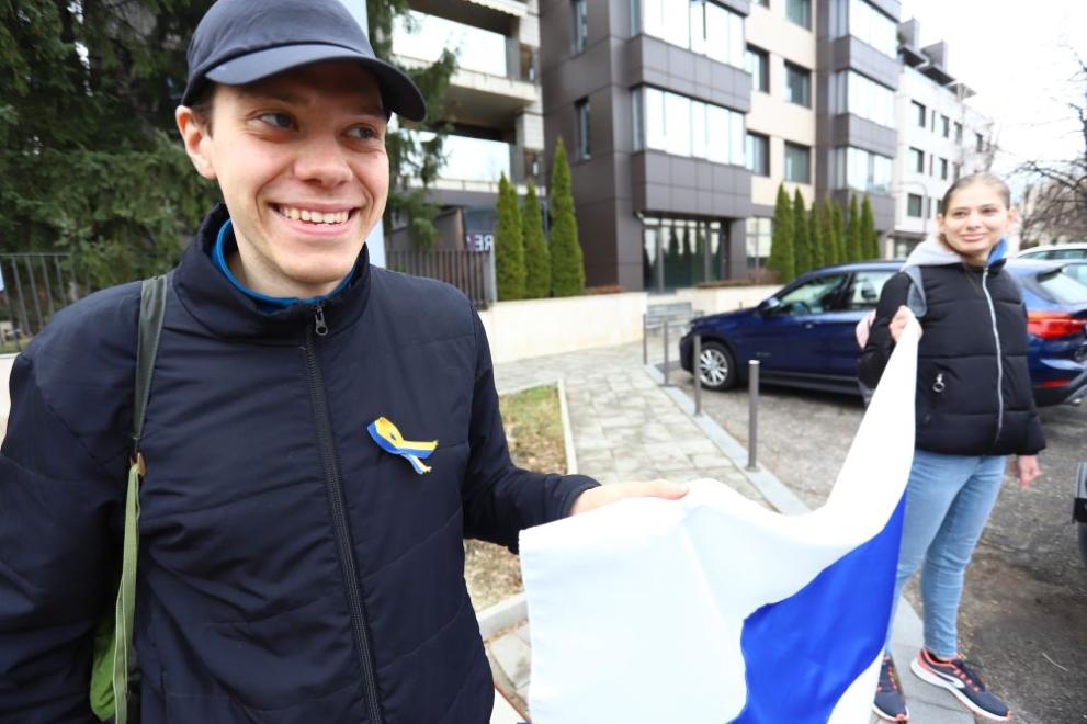 БГНЕС Димитрий описа пред БГНЕС, че от четири месеца е в България, работи и желае да живее тук. Т ой се дефинира отчасти като руснак и уточни, че знамето, което носи в цветовете бяло-синьо-бяло, символизира желанието за по-свободна Русия. " Аз не съм желал тази война ", съобщи Димитрий, като акцентира, че и останалите руснаци не я желаят. Той уточни, че войната не е решение на съветския народ, а на различен човек.