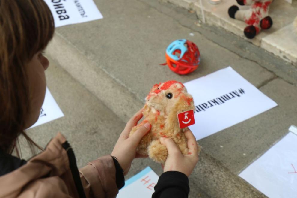 Пред централата на Българска социалистическа партия се организира флашмоб. Участниците оставиха играчки намазани с алена багра.
