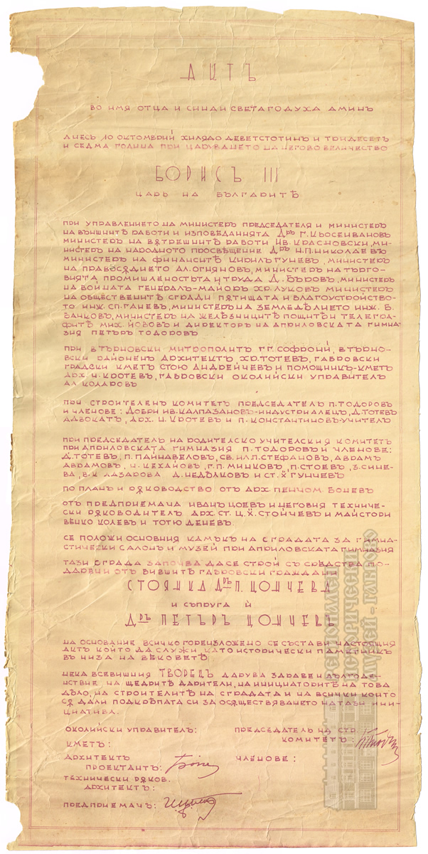 В основите на постройката се поставя особено художествено направен и подложен в железна кутия Акт. В него са посочени денят и годината, името на Цар Борис III, изброено е поименно държавното управление, имената на Великотърновския митрополит и районния проектант, габровския околийски шеф, кмета и помощник-кмета на Габрово, членовете на Родителско- учителския съвет при гимназията, членовете на строителния комитет, архитекта на постройката, не са забравени предприемачът и майсторите, които ще съграждат зданието.