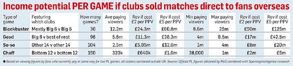 Сега Daily Mail разкрива една значима детайлност от плана, която евентуално е била измежду огромните цели на грандовете. Те са упорствали всеки клуб да има право да продава ТВ правата в чужбина за осем свои срещи в границите на един сезон, като това да започва от акция 2022/23. За образец, през предходния шампионат Ливърпул е получил към 61 млн. паунда от общия фонд от 1,1 милиарда паунда, който се разпределя сред всичките 20 клуба за излъчването на срещите им зад граница. В същото съгласно проектите на “Project Big Picture ” Ливърпул и Юнайтед са се надявали да прибират по 125 млн. паунда единствено от един дуел. Ако се беше осъществила концепцията за по осем такива срещи, мърсисайдци и “червените дяволи” щяха да могат да забогатяват с по 1 милиарда паунда в границите на един сезон. Тези сметки са планирани при такса от 5 паунда на клиент по схемата “пей пър вю”.