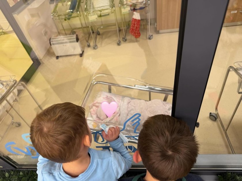 Разбира се, след това се появи и фотография на бебето, което е със закрито личице, а двамата му батковци го гледат през прозореца, с цел да го опознаят добре.
