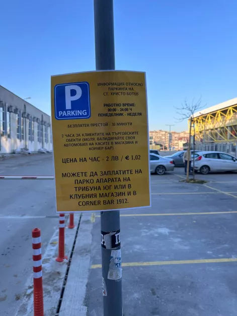 Преди дни на всички входове на паркинга към стадион „ Христо Ботев “ бяха сложени бариери и осведомителни табели с изискванията за прилагане. Според оповестената информация безплатният престой е до 30 минути, след което се заплаща такса от 2 лв. на час (1,02 евро). Паркингът е с работно време 24 часа в денонощието, 7 дни в седмицата, като заплащането се прави посредством паркомат. Като опция е посочена опция за възнаграждение в обект „ Корнер бар “, ситуиран наоколо. За клиенти на заведението и други търговски обекти е очакван до 2 часа безвъзмезден престой.
